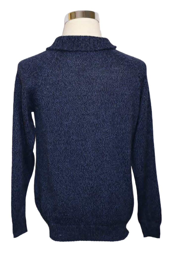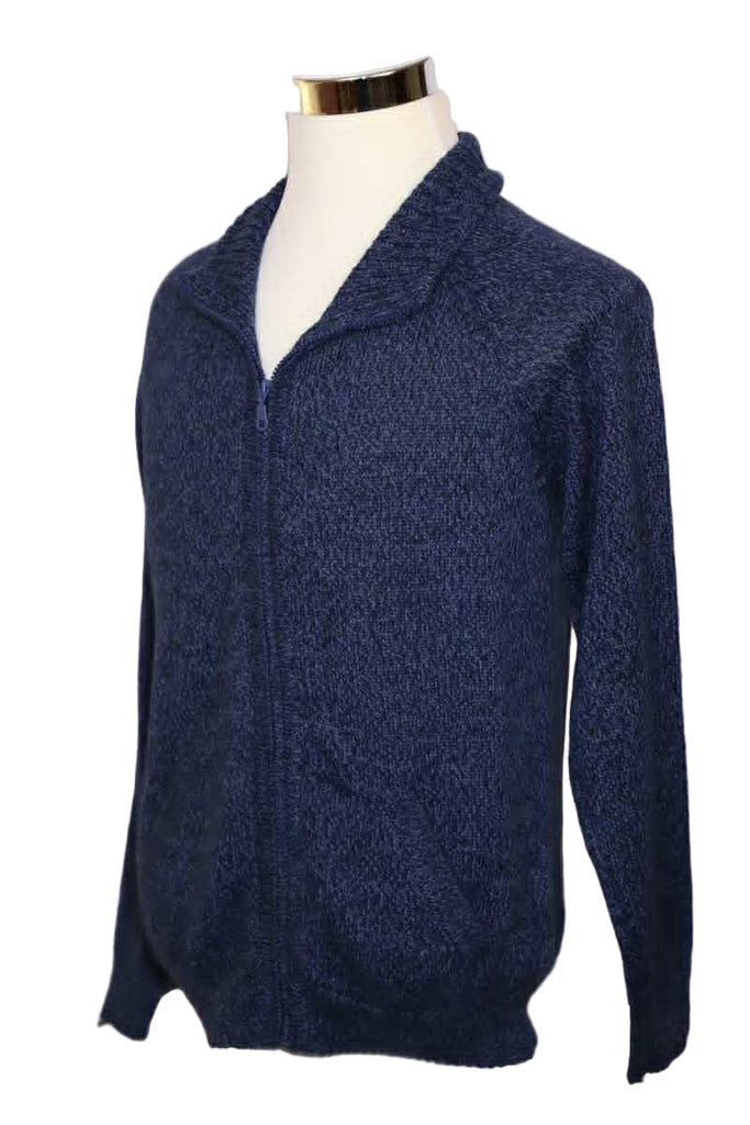 This is a beautiful Marbled Blue men's full zip cardigan. It is extremely soft to the touch, hypoallergenic, and warm. It is a blend with 50% alpaca, 5% wool, and 45% acrylic.