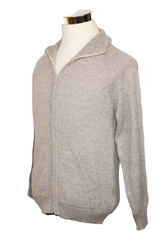 This is a beautiful Marbled Beige men's full zip cardigan. It is extremely soft to the touch, hypoallergenic, and warm. It is a blend with 50% alpaca, 5% wool, and 45% acrylic.