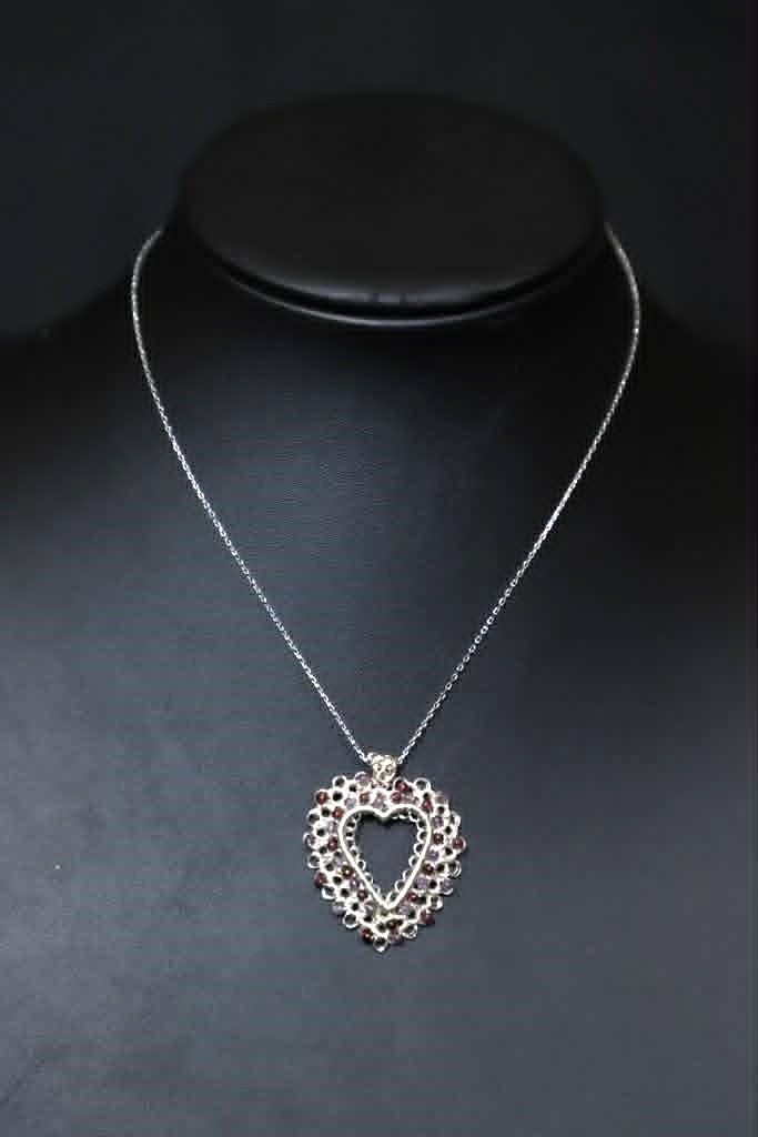 This sterling wire crochet garnet and amethyst heart pendant necklace is made out of .999 sterling silver. The pendant measures 1 1/4"x 1 1/16". It comes on an 18" silver chain. This a fair trade item from Peru.