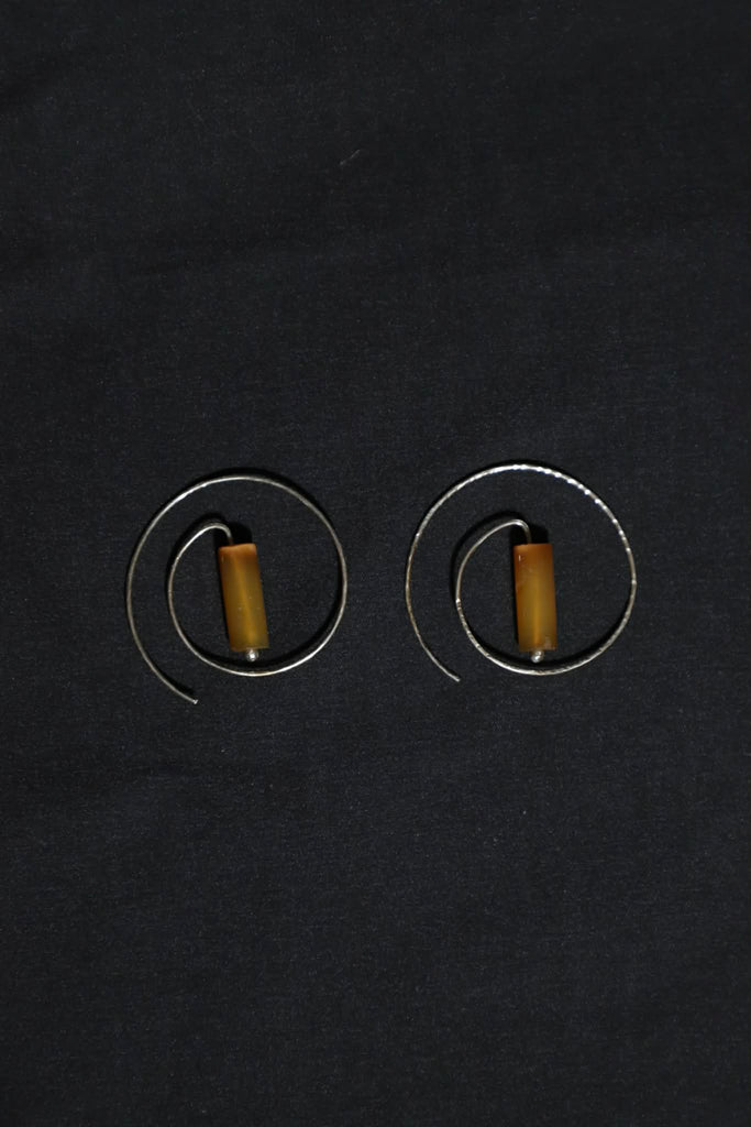 These sterling silver earrings were created out of sterling silver and citrine. They measure 1.75" in diameter, and the natural stones are .75" x 1/4". They are fair trade items from Peru.