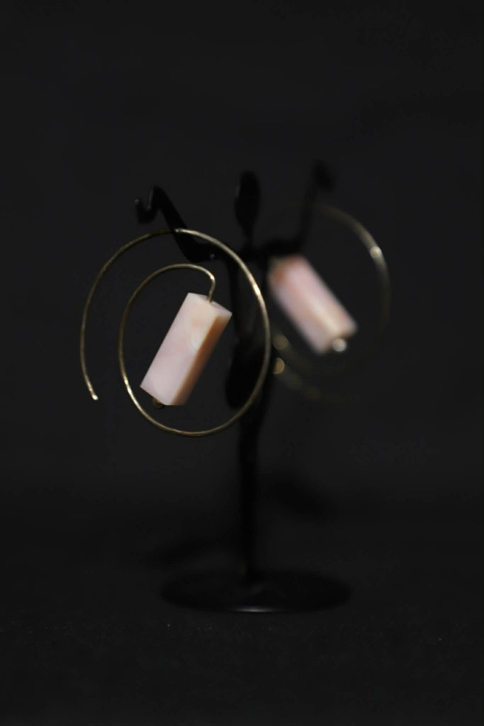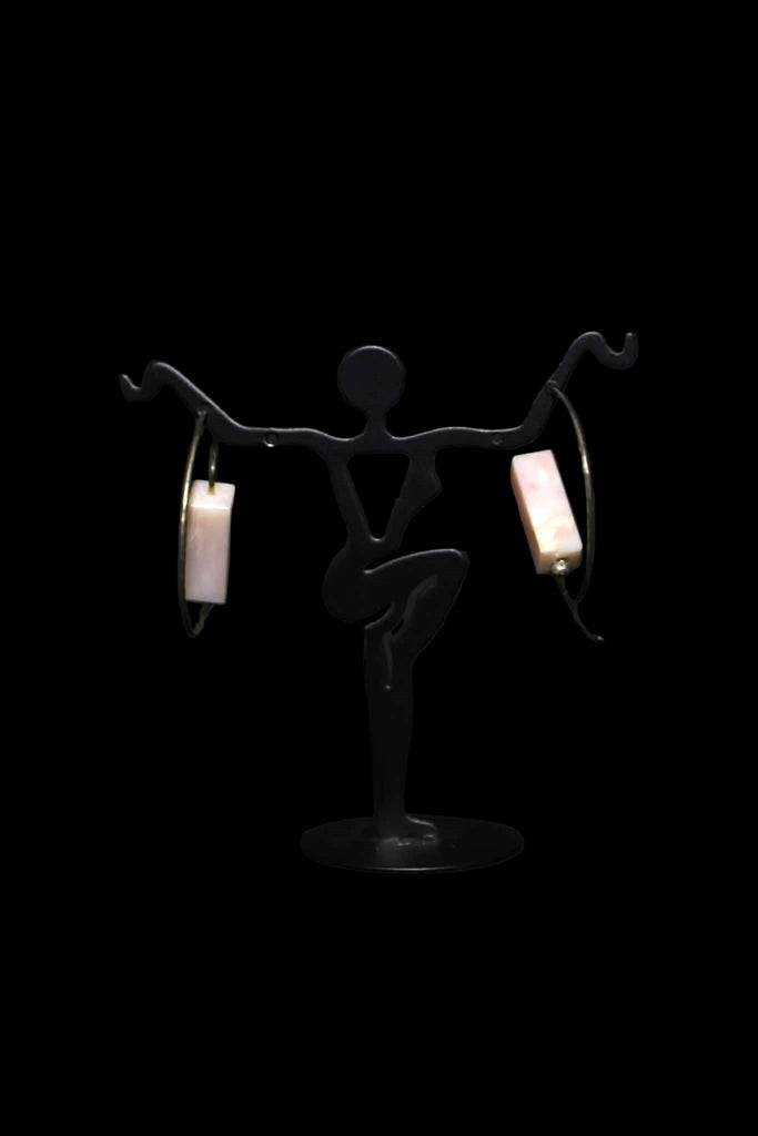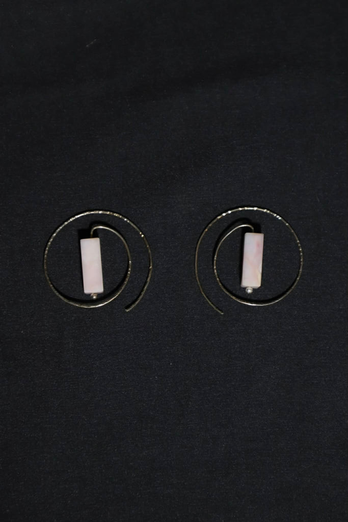 These sterling silver earrings were created out of sterling silver and rose quartz. They measure 1.75" in diameter, and the natural stones are .75" x 1/4". They are fair trade items from Peru.