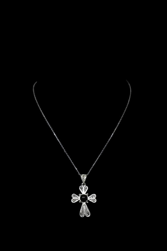 This Onyx Filigree Cross necklace pendant is made out of 950 sterling silver. The pendant measures 1 1/2" x 1". It can come with a 16" or 18" silver chain upon request. This a fair trade item from Peru.