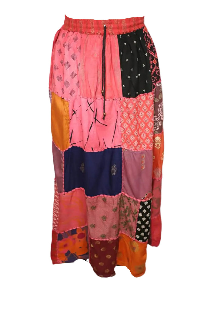 These beautiful patchwork bohemian upcycled/repurposed skirts are made in India using cotton, silk, and rayon. They have a drawstring to ensure proper fit. They are approximately 41" long and one size fits small through large. These are fair trade items.