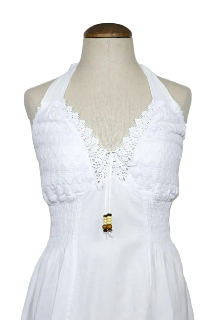 This beautiful Bohemian style, pre-washed halter top dress is made out of organic cotton. , This is a fair trade item from Peru.