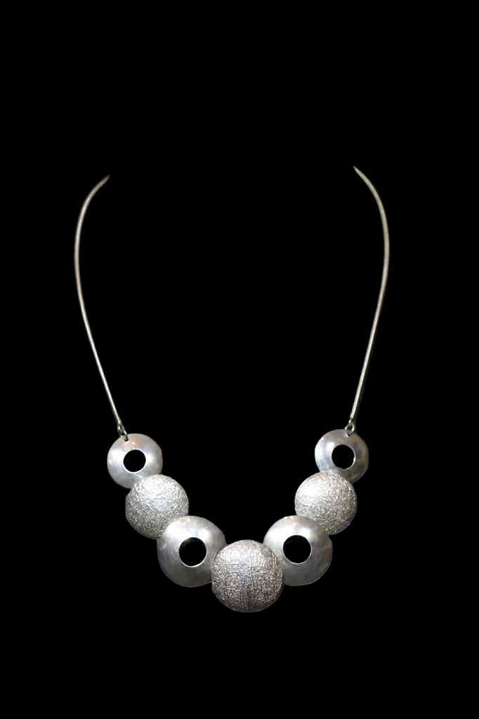 This is 9.50 texturized sterling silver necklace with a 21" round snake chain. The disks measure between 7/8" to 1 1/8". This a fair trade item from Peru.